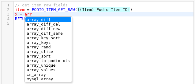 As you type, the editor will display all matching keywords for you to select from. Selecting one inserts it at the current cursor position.
