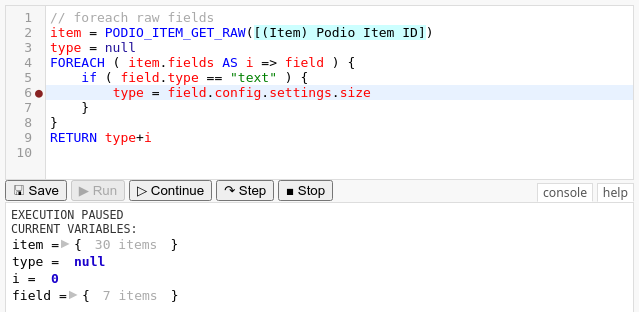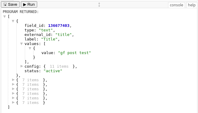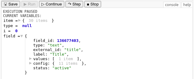 Just like with program return above, any variables that are objects or arrays can be interactively inspected by expanding / collapsing keys and nodes.